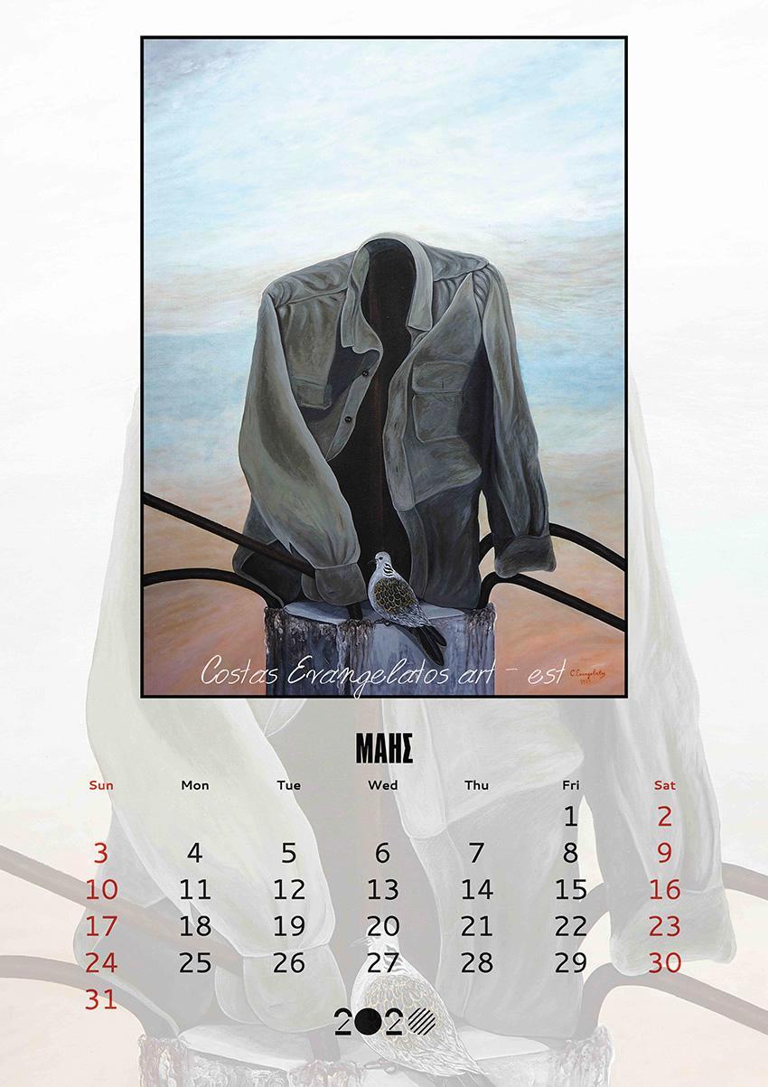 Πολλές φορές η καλλιτεχνική έκφραση διαισθάνεται τις καταστάσεις που επακολουθούν. Η επιλογή του έργου μου για το εικαστικό, συλλεκτικό Ημερολόγιο του 2020 της Σύγχρονης Πινακοθήκης Villa Ροδόπη, με τίτλο "Εννοιακά βλέμματα", μικτή τεχνική σε καμβά, που παρουσιάζει ατέρμονα βλέμματα να παρακολουθούν και να ελέγχουν ένα ρέον σύμπαν, πόσο ταιριάζει με τον φετινό Μάη... Αλλά και η επιλογή για τον μήνα Μάιο από το Διοικητικό Συμβούλιο της Χορωδίας και Μαντολινάτας Αργοστολίου για το επετειακό ημερολόγιο της του 2020, του εμβληματικού νεανικού έργου μου, με τίτλο "Μνημείο Εποχής", που ζωγράφισα το 1978-79 στη μεγάλη σειρά των Αντιμιλιταριστικών έργων μου και εκτέθηκε το 1981, προσφέροντας μου υποτροφία για σπουδές στη Νέα Υόρκη, είναι λίαν χαρακτηριστική. Στη σύνθεση ο υπό οικοδόμηση κόσμος της τσιμεντένιας στήλης γίνεται σώμα για το κενό στρατιωτικό πουκάμισο, που μέσα του φωλιάζει και κουρνιάζει αμήχανη η τρυγόνα, σύμβολο της Αγάπης.